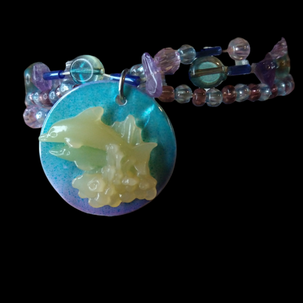 Glass beads and a shell with resin dolphins.